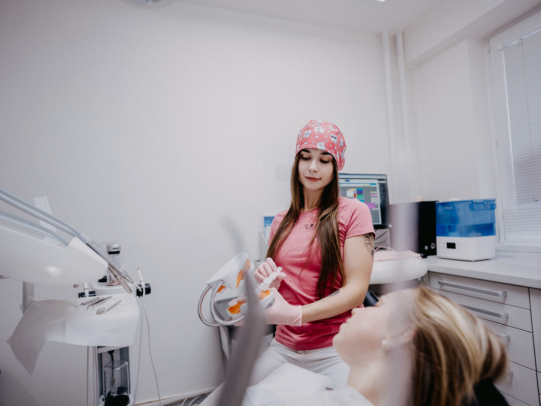 Když dorazíte na adresu naší ordinace a vstoupíte dovnitř, čeká vás přátelské přivítání v moderním prostředí naší ordinace. Přivítá vás naše dentální hygienistka a detailně vás provede celým procesem, vysvětlí jednotlivé kroky a zodpoví případné otázky. V tu chvíli se můžete v klidu posadit do stomatologického křesla.
